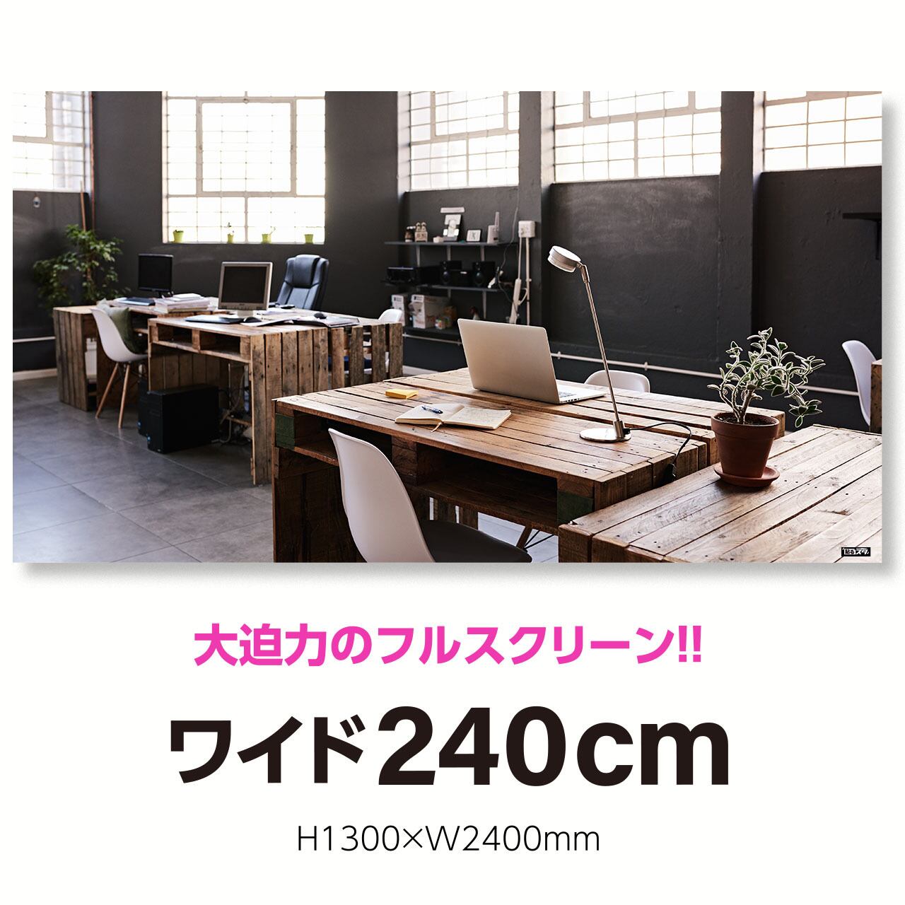高さ1m30cm横幅2m40cmの特大スクリーンタイプ。テレワークはもちろん、Youtubeなどの本格的な動画配信ブースの背景に大活躍のドデカサイズ!! 個性溢れる即席スタジオであなた独自を演出しよう!!