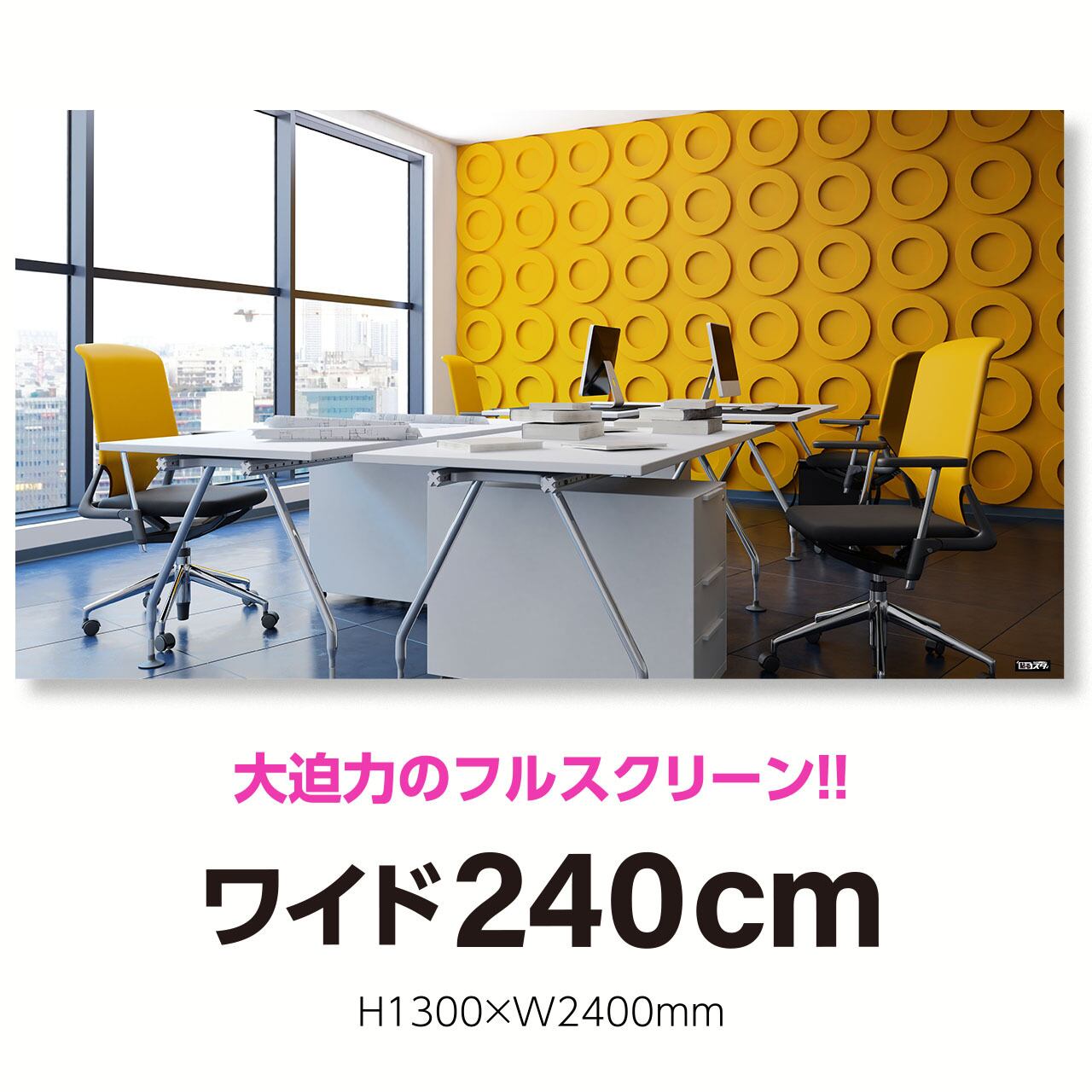 高さ1m30cm横幅2m40cmの特大スクリーンタイプ。テレワークはもちろん、Youtubeなどの本格的な動画配信ブースの背景に大活躍のドデカサイズ!! 個性溢れる即席スタジオであなた独自を演出しよう!!